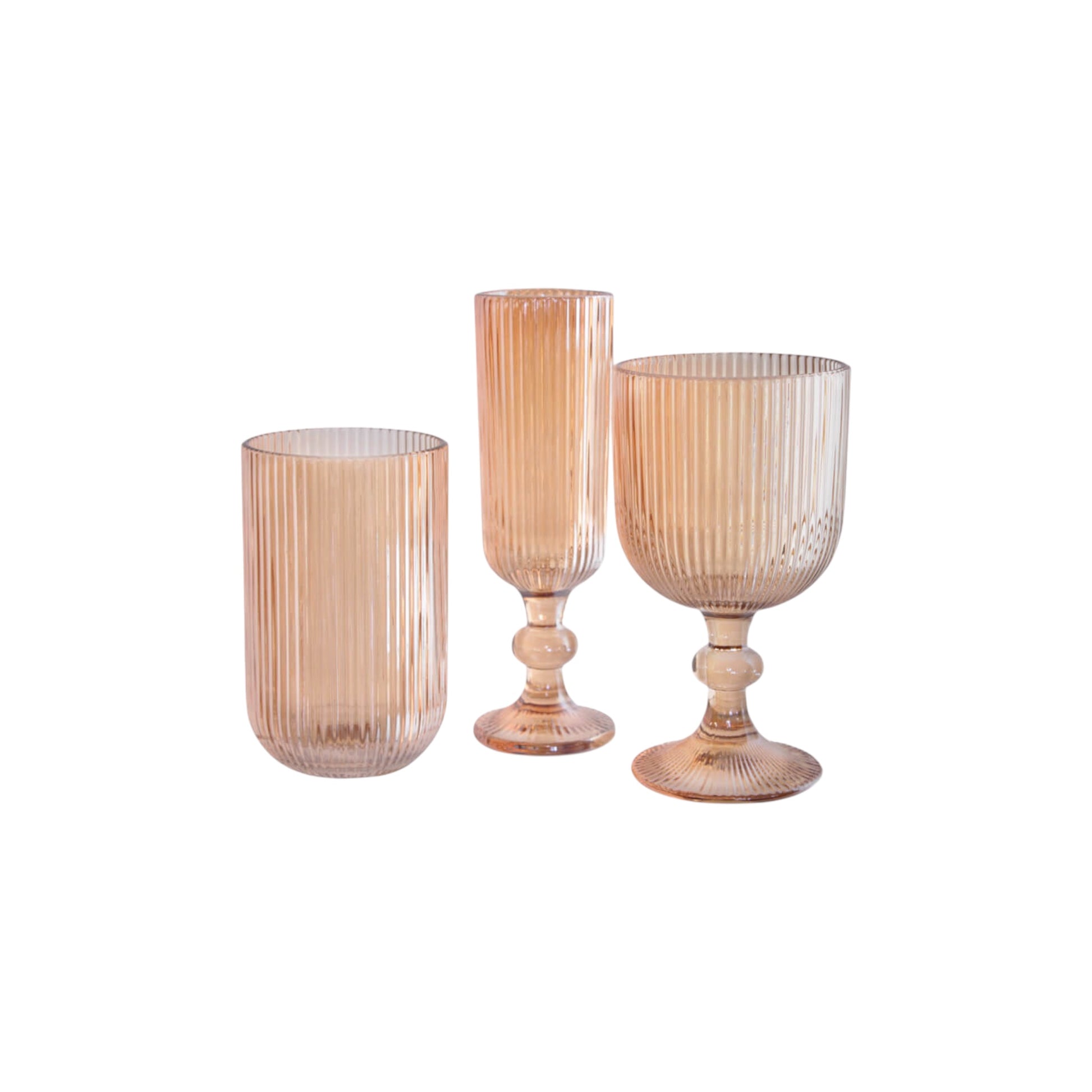 Elevate your alfresco table setting with these exquisite ribbed glass tumblers and stemware. Crafted in a beautiful array of coloured glass, each piece catches the light beautifully — adding a soft, golden glow to outdoor gatherings. The delicate vertical ribbing brings a touch of vintage charm, while the modern silhouette and sculpted stems create an effortlessly refined look. Perfect for everything from sparkling brunches to sunset soirées, these glasses make every sip feel like a celebration.