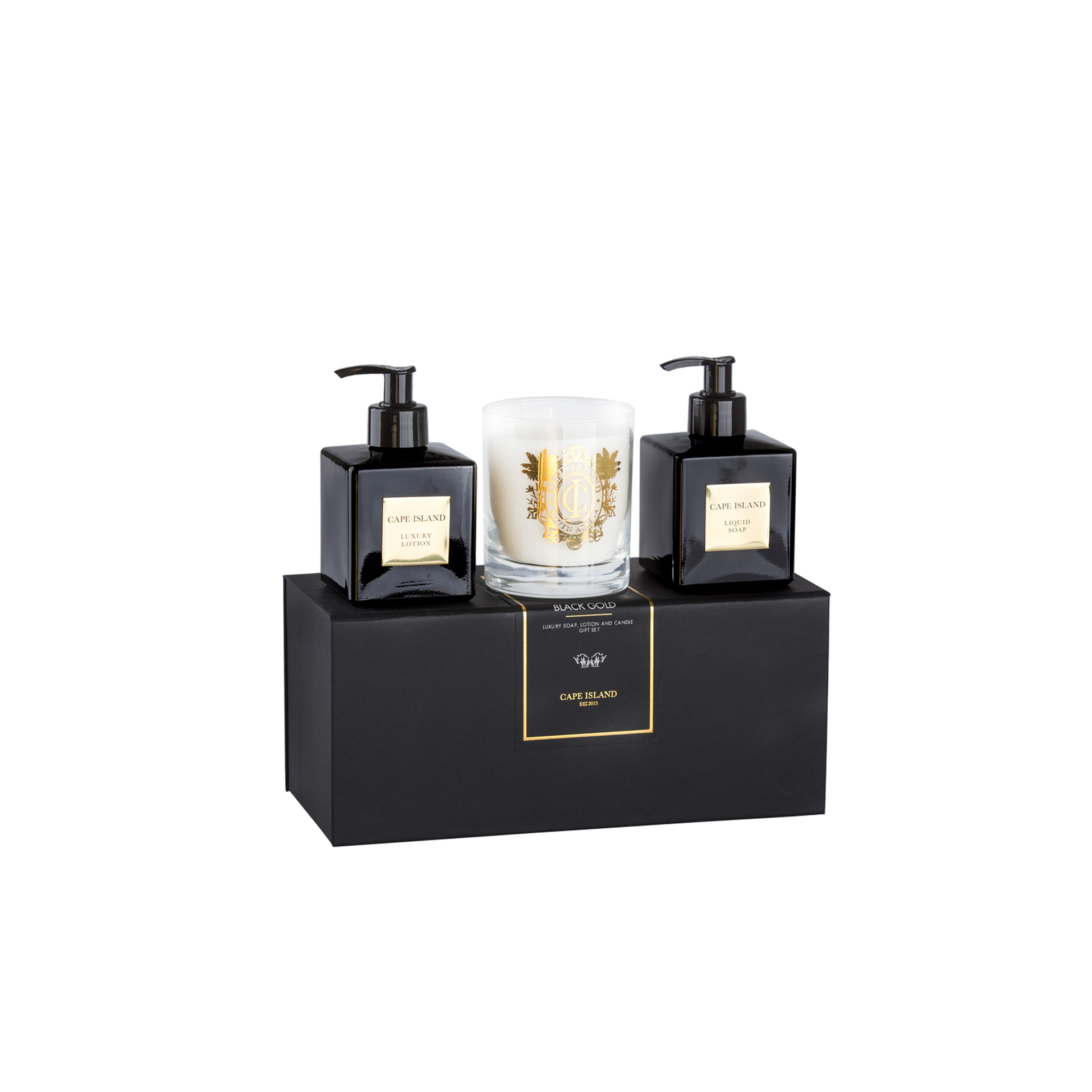 Honour Africa’s natural wealth through the medium of fragrance with this all-in-one classic boxed set in black. Enjoy the best of both worlds with a single wick 250ml candle and a soap & lotion set all fragranced with the bold Black Gold scent. Our glass bottles are filled with all natural goodness and have a refillable, timeless design giving them longevity in your home.