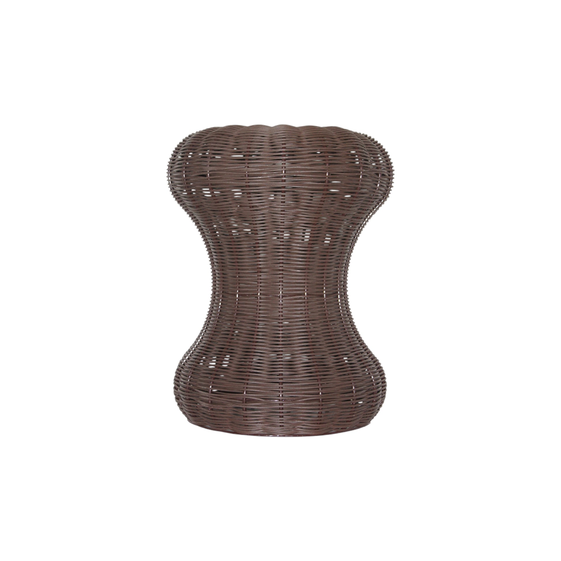 Sculptural yet understated, this woven stool brings warmth and texture to any interior or covered outdoor setting. Crafted in a rich mocha brown synthetic weave, its gently hourglass silhouette creates a sense of balance and visual softness, while the open weave adds lightness and depth.