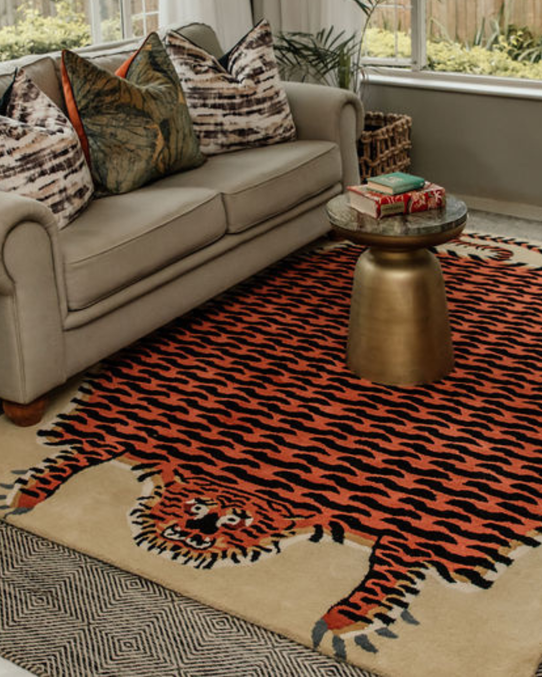 For those who desire more than just minimalism, consider an Exotic tiger rug for your space. This hand-tufted rug, crafted by skilled artisans in India, is made from soft and durable Indian wool. Its bold and unapologetic design adds comfort and style to any space, while its unique hand-tufted charm makes it a standout piece. Whether it's dance parties or dramatic entrances, these rugs are built to handle anything and are the perfect addition to elevate any room.