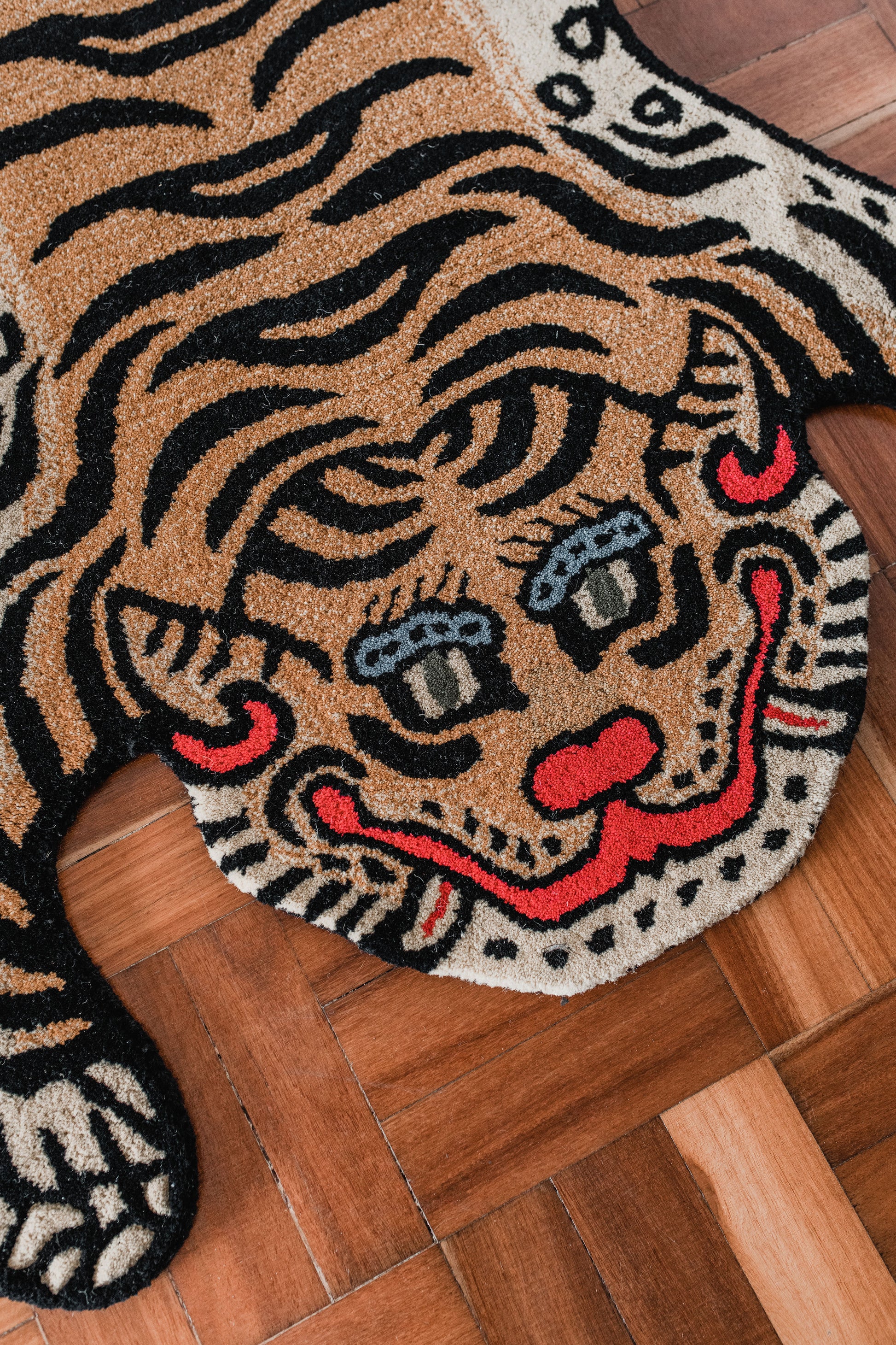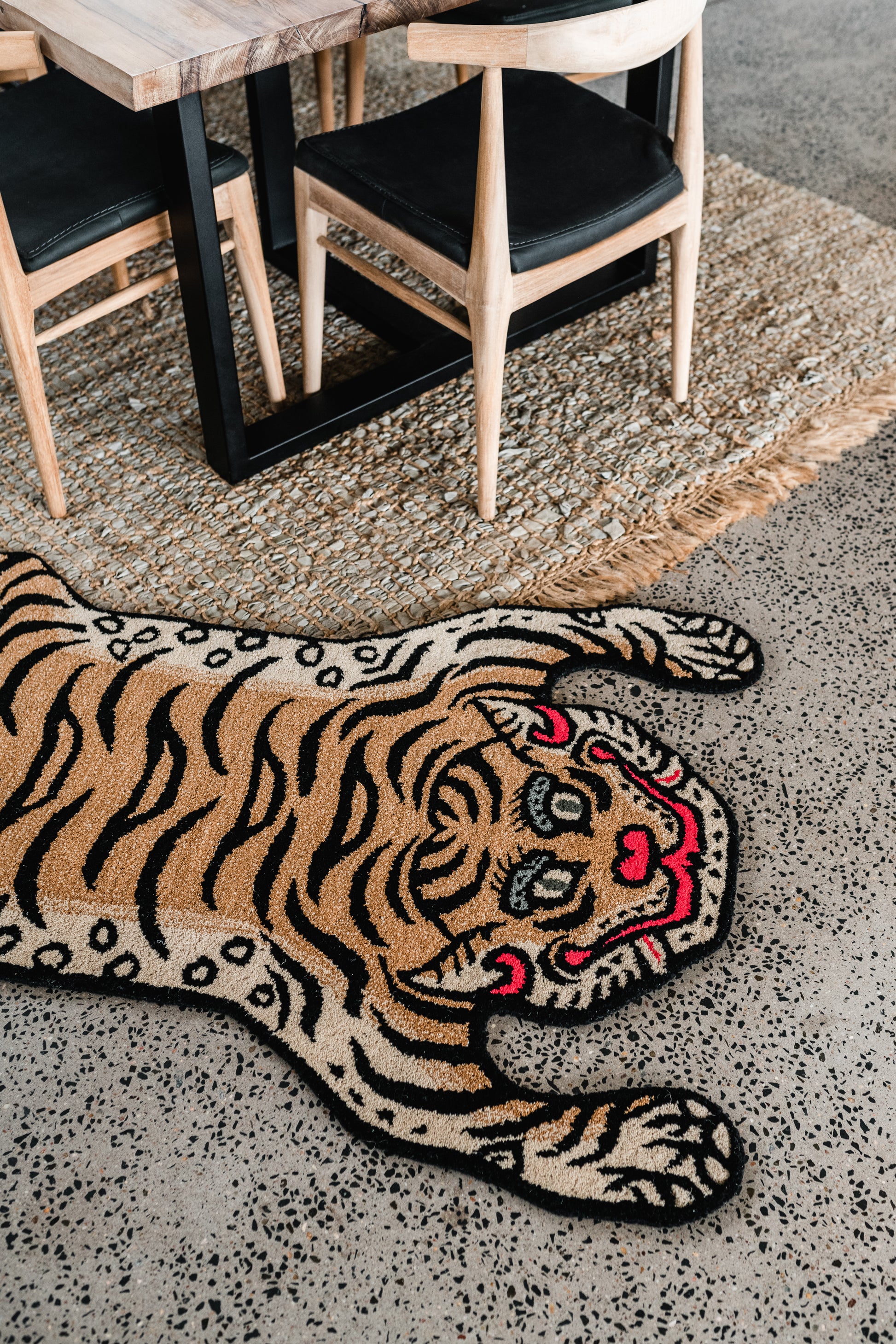 For those who desire more than just minimalism, consider an Exotic tiger rug for your space. This hand-tufted rug, crafted by skilled artisans in India, is made from soft and durable Indian wool. Its bold and unapologetic design adds comfort and style to any space, while its unique hand-tufted charm makes it a standout piece. Whether it's dance parties or dramatic entrances, these rugs are built to handle anything and are the perfect addition to elevate any room.