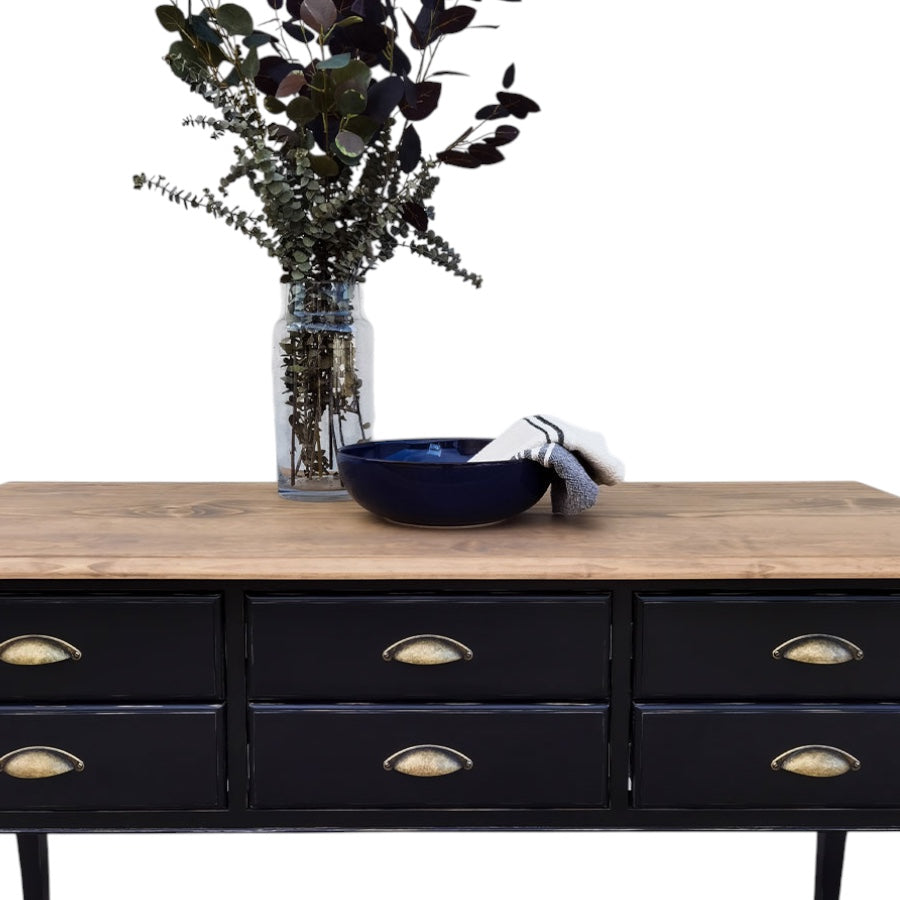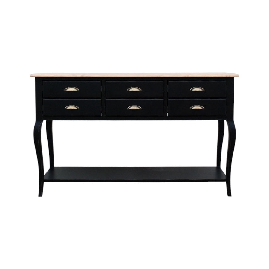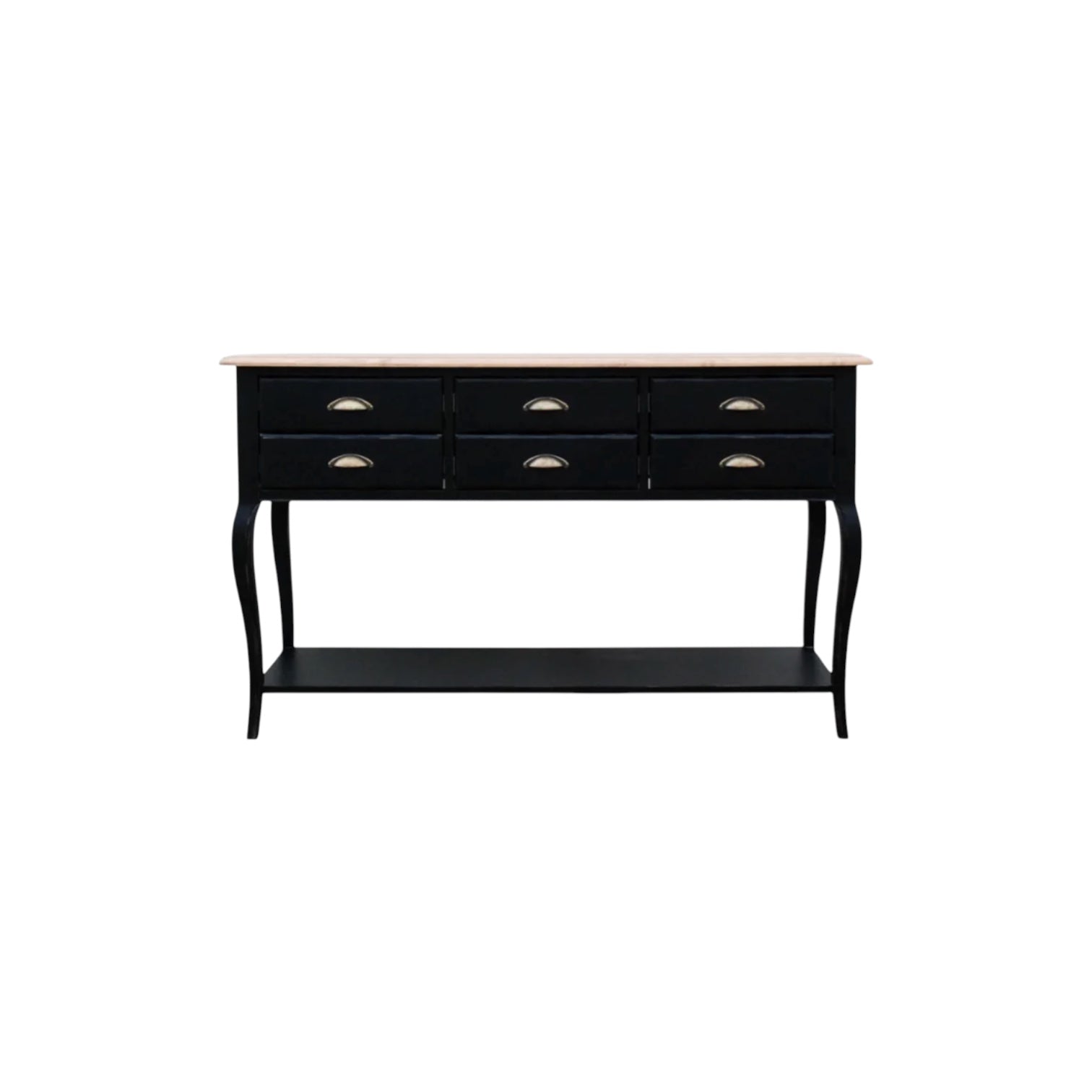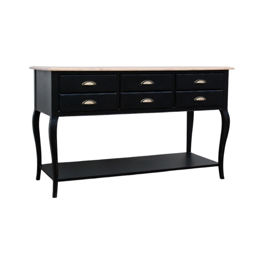 Drawing inspiration from Queen Anne design, The Frances server is made from solid pine wood. It features a technique black finish, while the solid pine top is treated with a walnut-colored oil and sealed with wood wax for added protection.