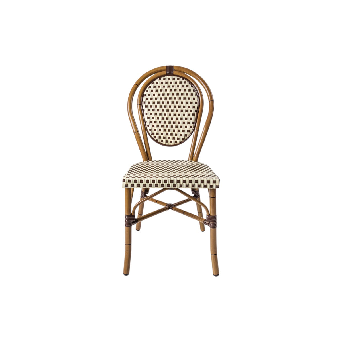 The Frenchie Outdoor Cafe Chair offers a durable solution for stylish outdoor seating. Featuring an aluminum frame that mimics the natural texture of bamboo, it combines elegance with strength. The brown and cream nylon weave is designed to withstand the elements, ensuring lasting beauty. Additionally, the chairs are stackable for convenient storage.