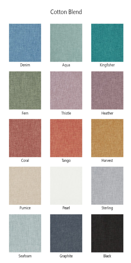 AVAILABLE COLOURS Denim, Aqua, Kingfisher, Fern, Thistle, Heather, Coral, Tango, Harvest, Pumice, Pearl, Sterling, Seafoam, Graphite, Black