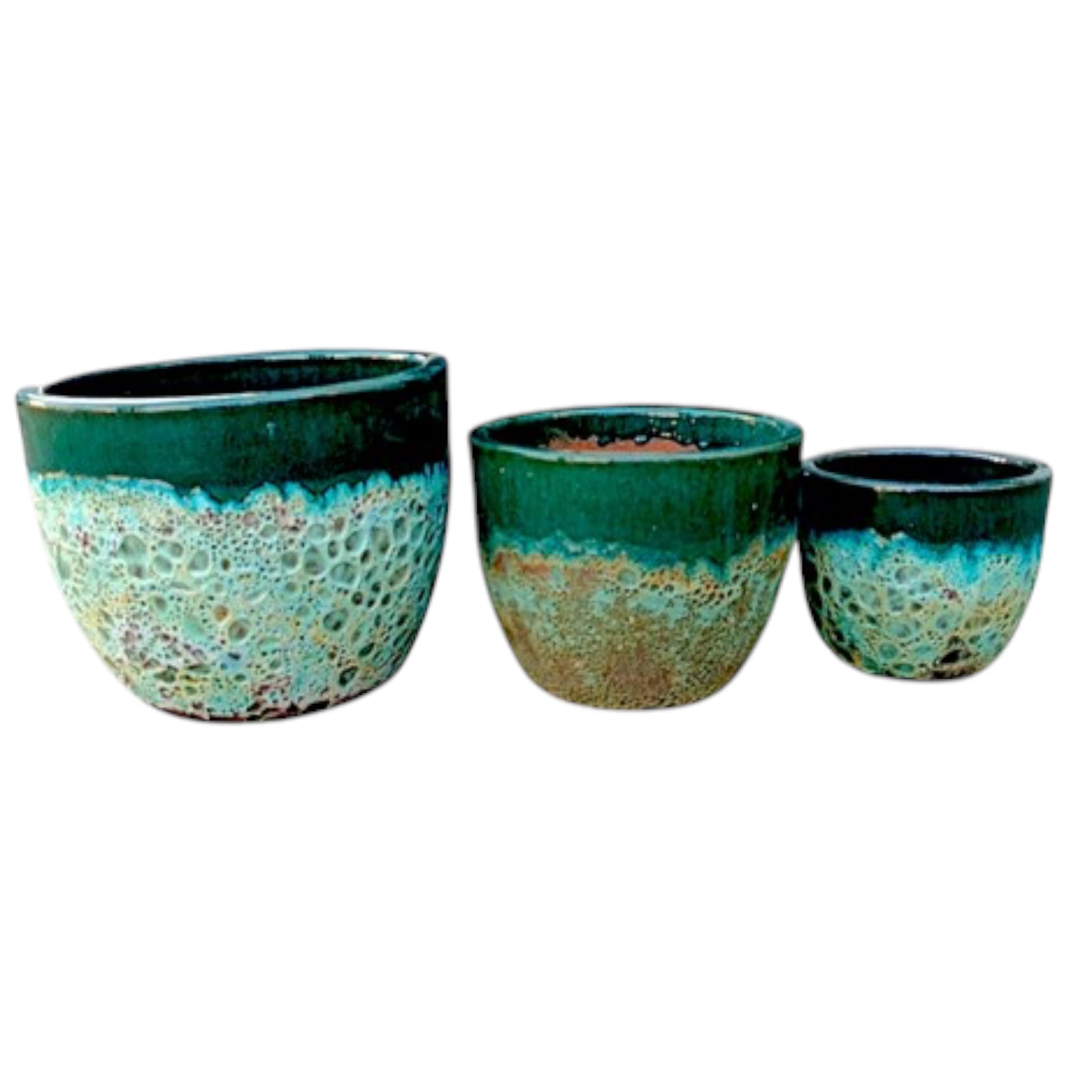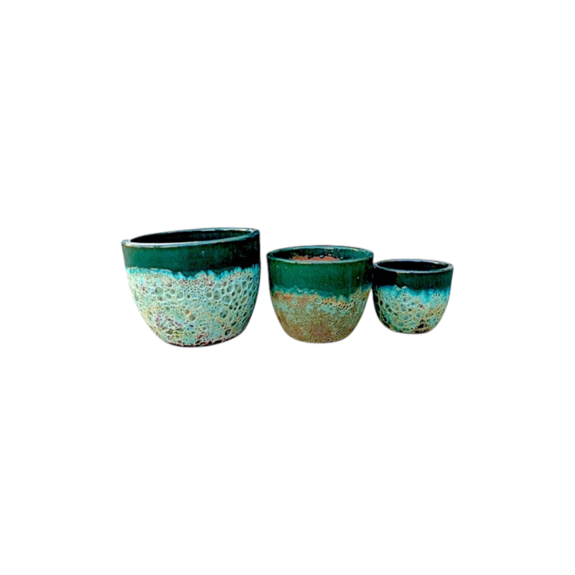 The Seaweed Planter Set features three ceramic pots in varying sizes, adorned with an elegant blend of green and aqua tones. Each piece is finished with a subtly textured, reactive glaze that effortlessly introduces a refined and distinctive character to your interior decor.