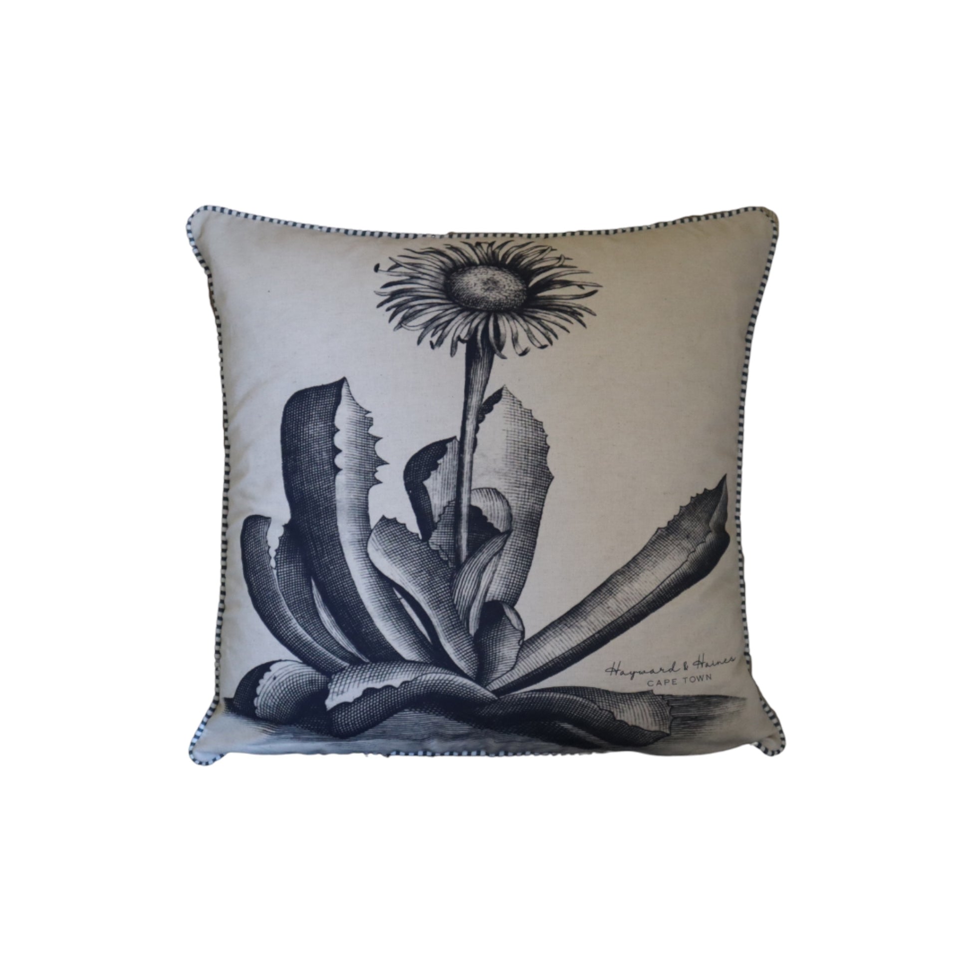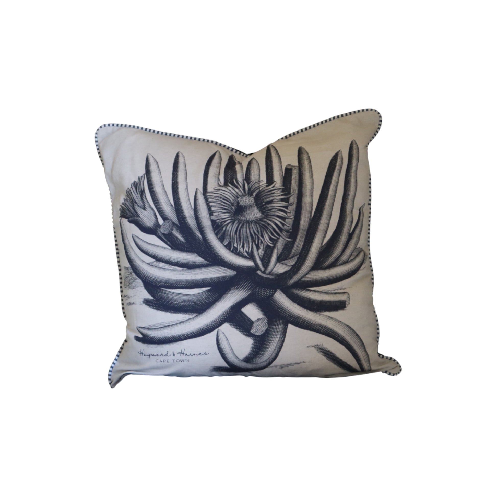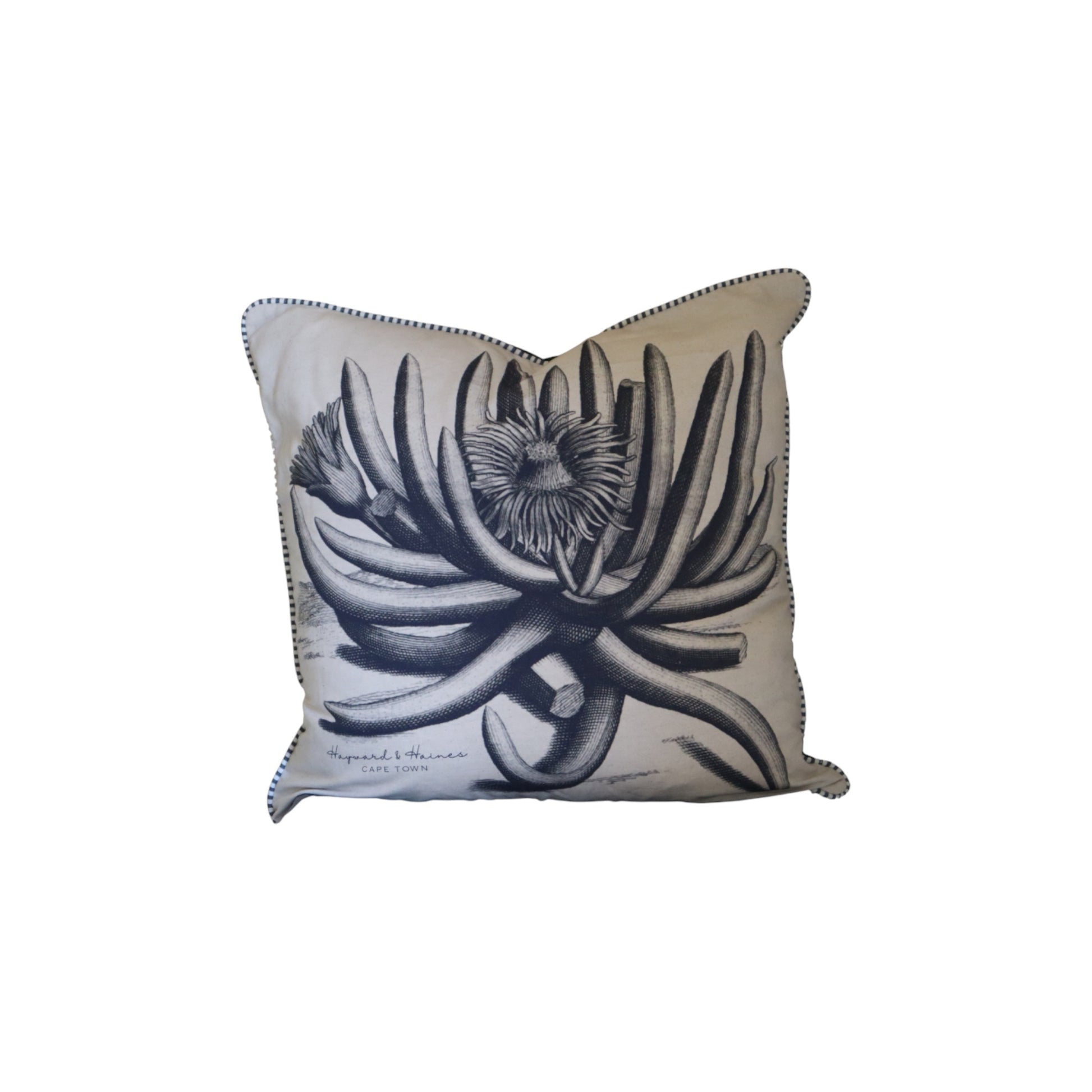 These cushion features prints that are vintage-inspired and have a botanical illustration style, giving them a timeless, naturalist look — perfect for interiors with a Cape heritage or nature-inspired aesthetic. The fine contrast piping along the edges gives it a tailored, finished look.