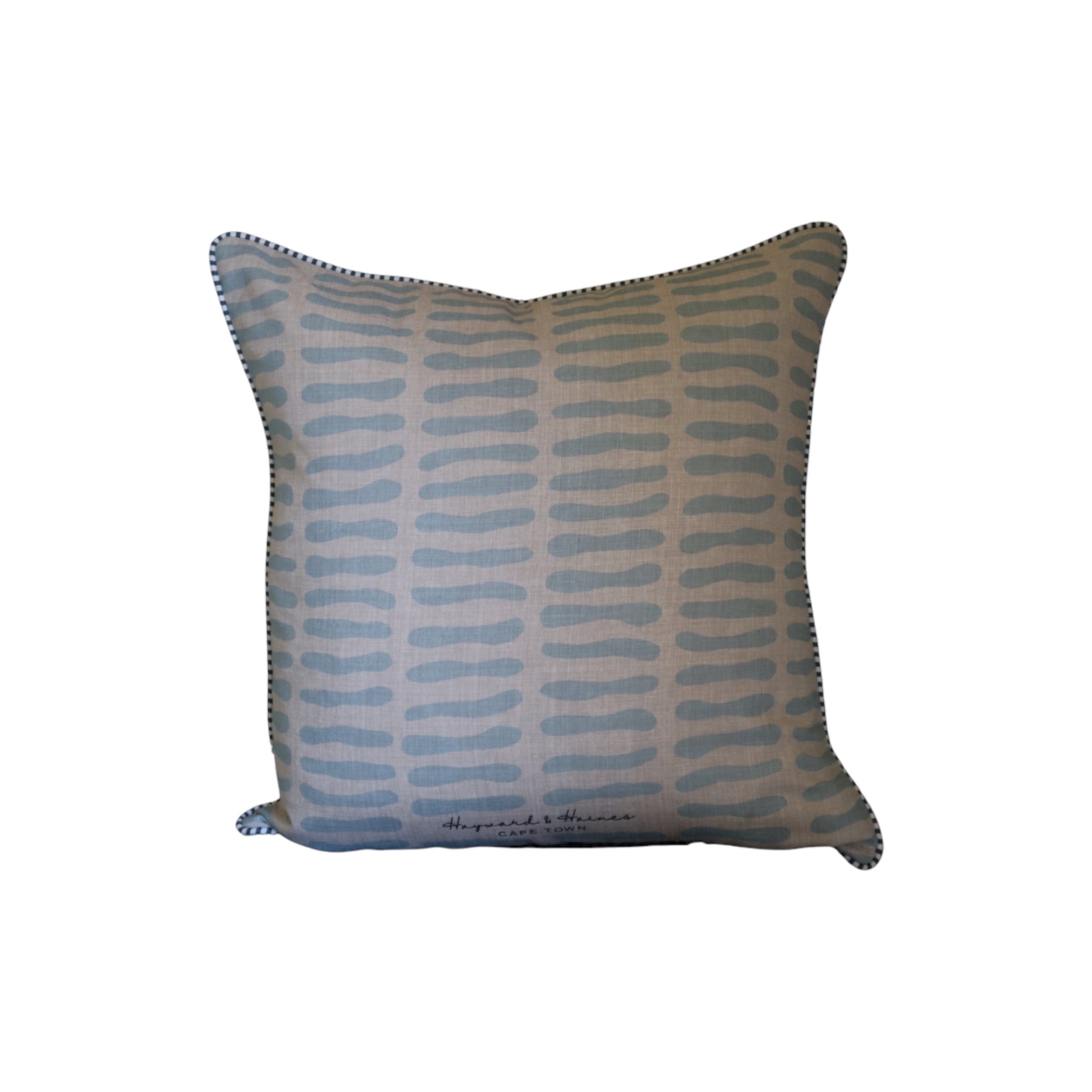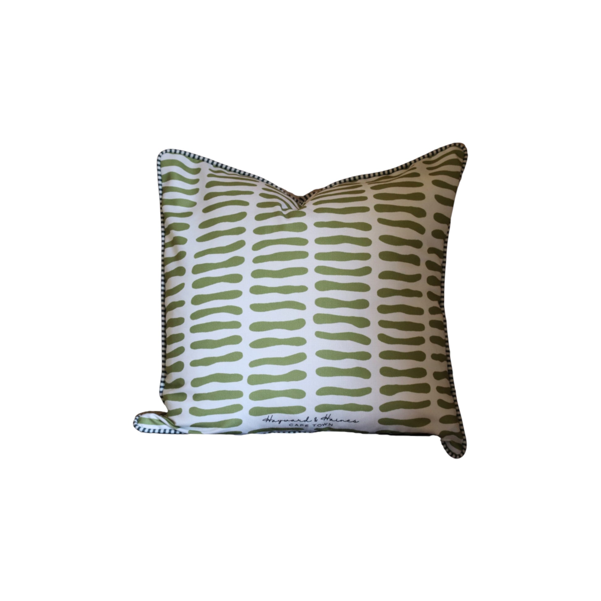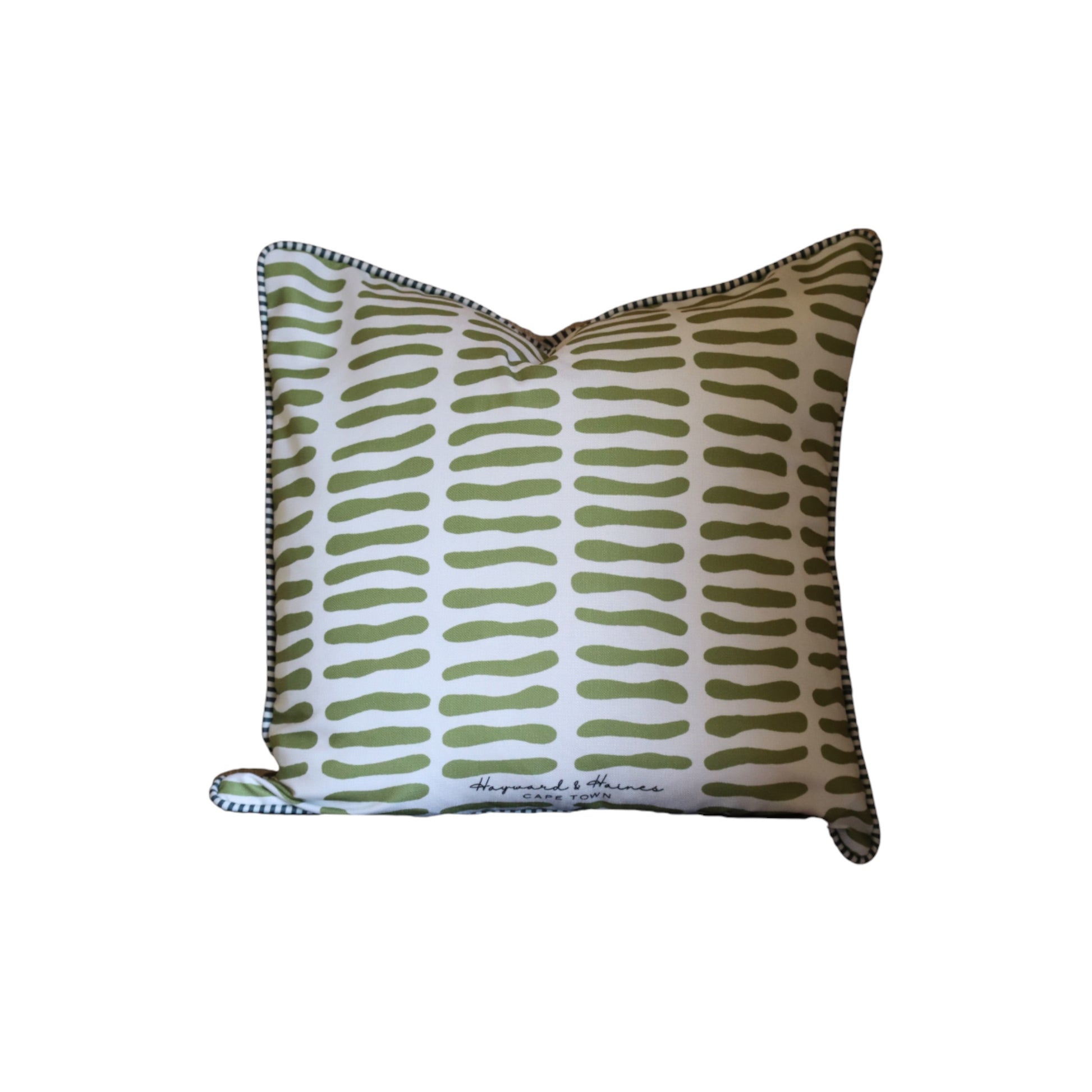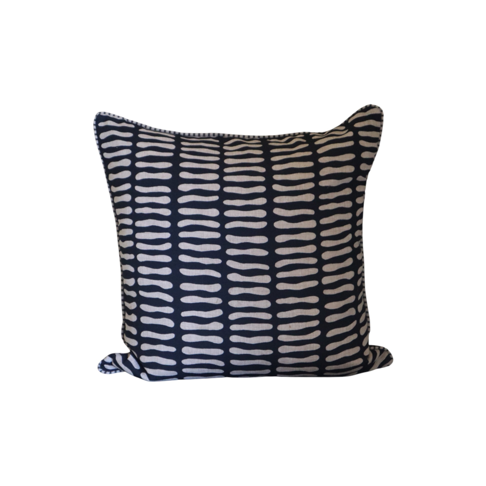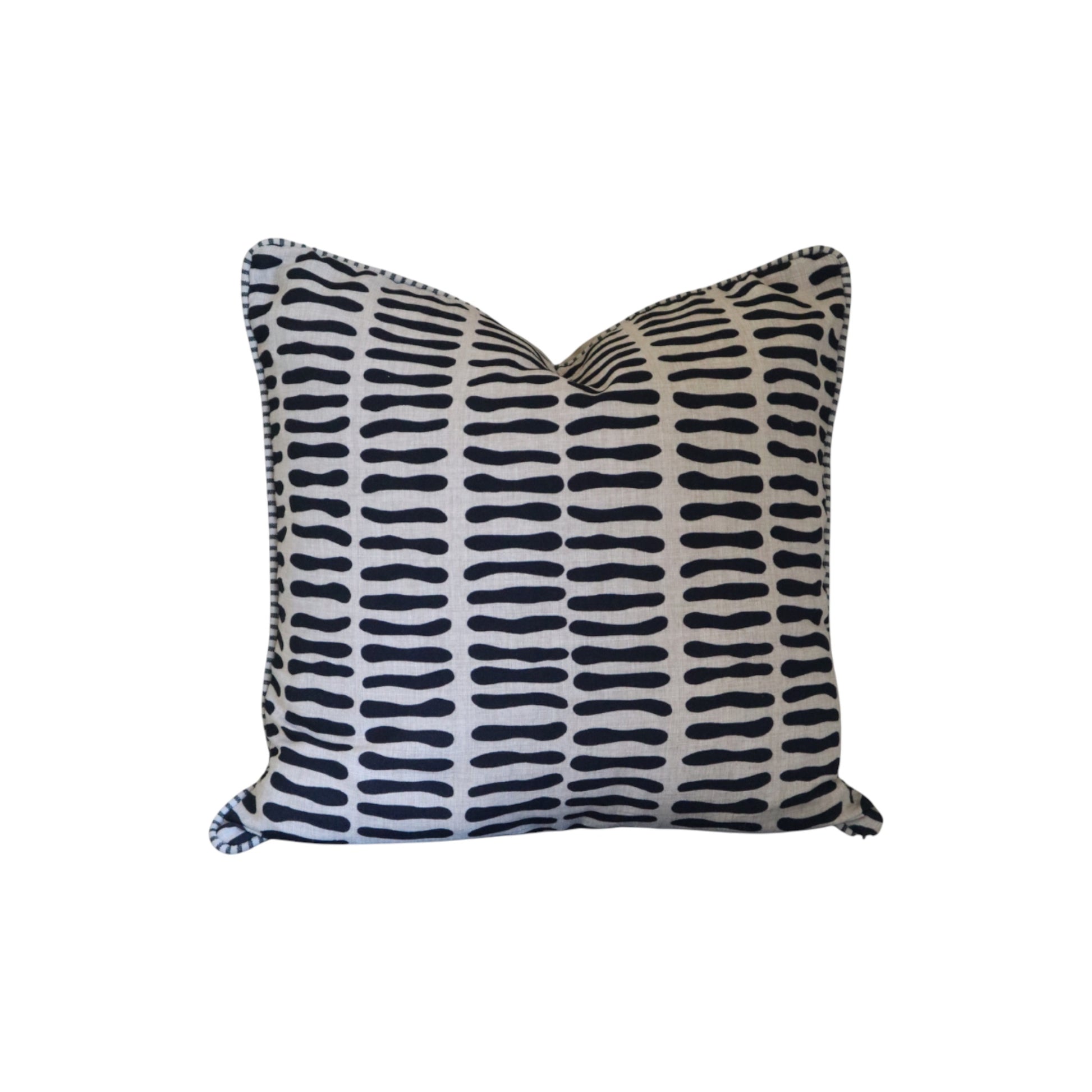 These cushion features an organic bean shaped stripe prints. The fine contrast piping along the edges gives it a tailored, finished look.