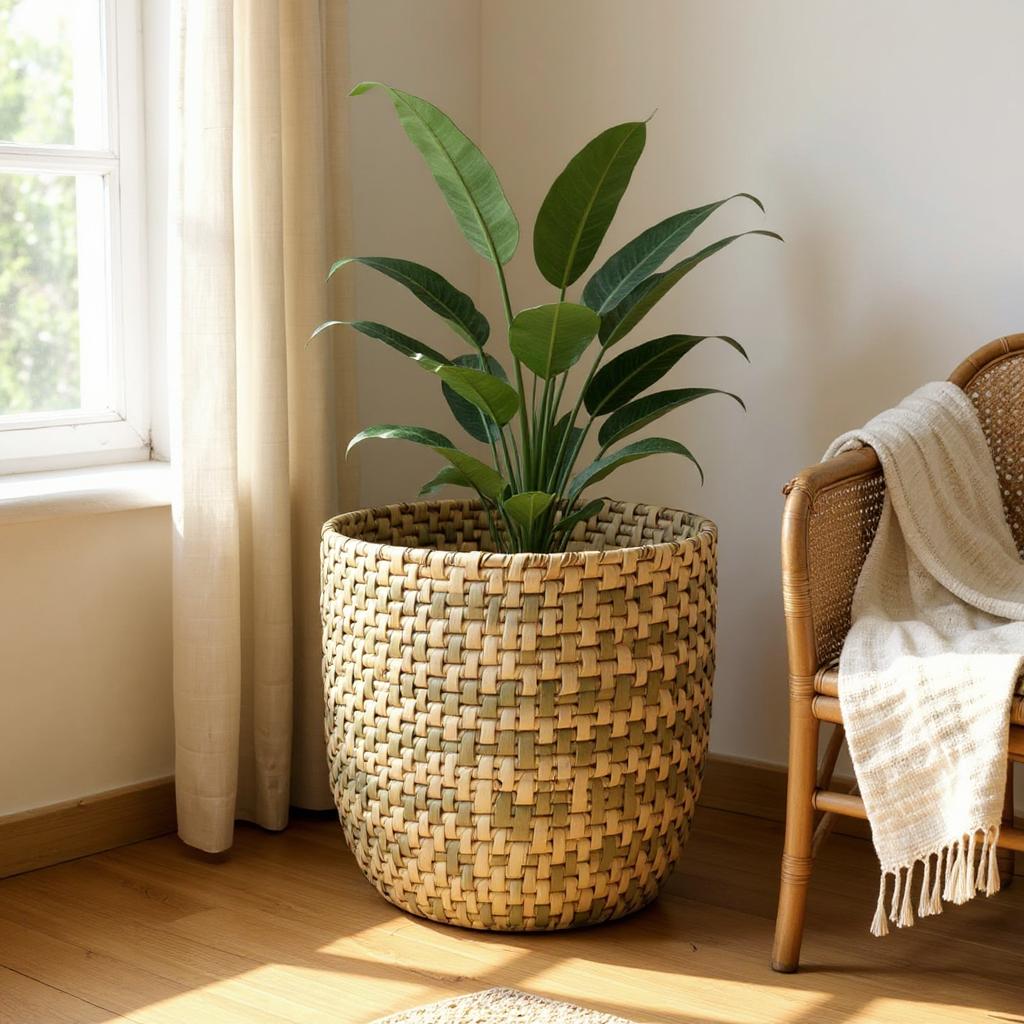 This large Okavango basket features a rich texture that elegantly fills empty areas, bringing warmth and depth to any room.