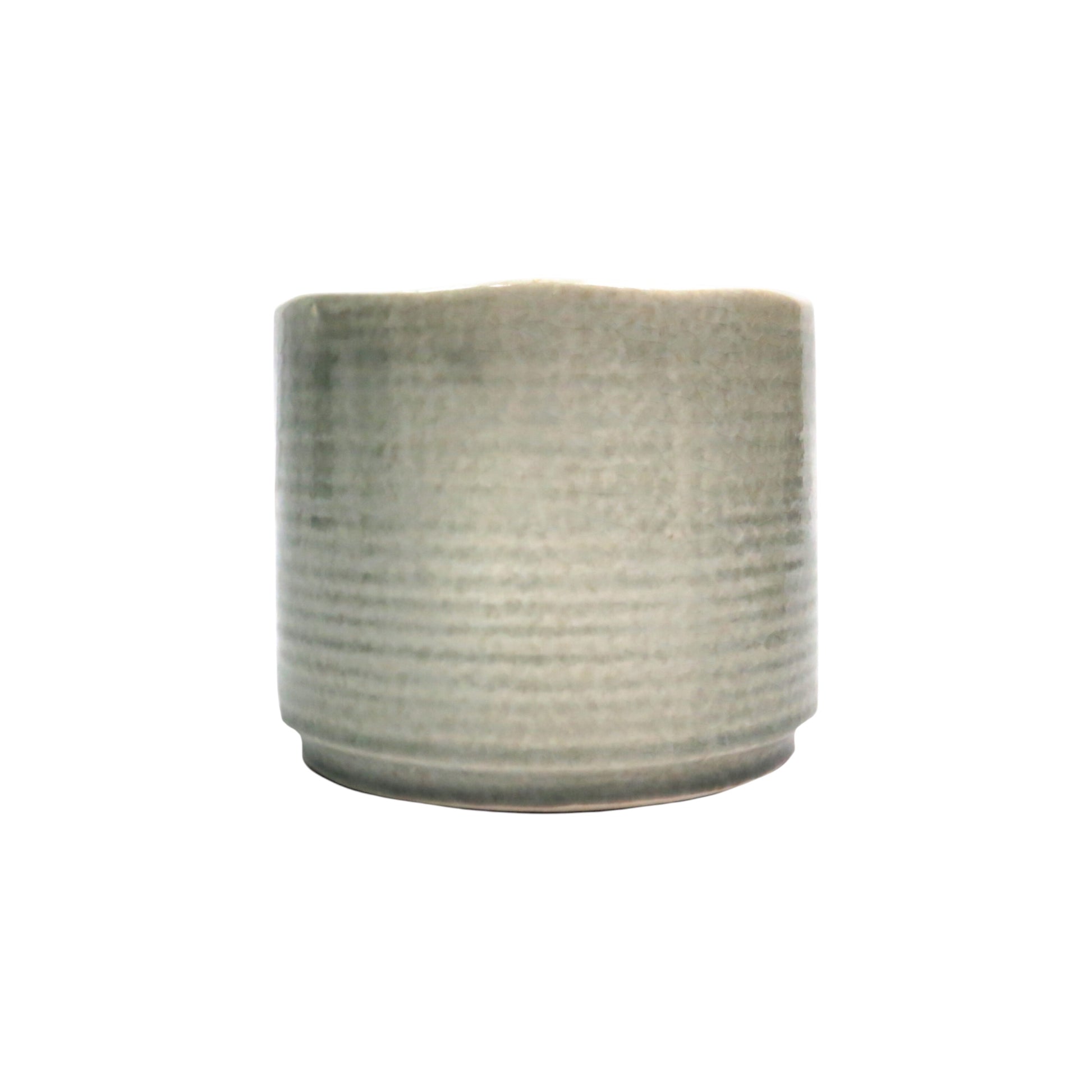 A grey ceramic planter with a waved edge and horizontal ribbed texture.