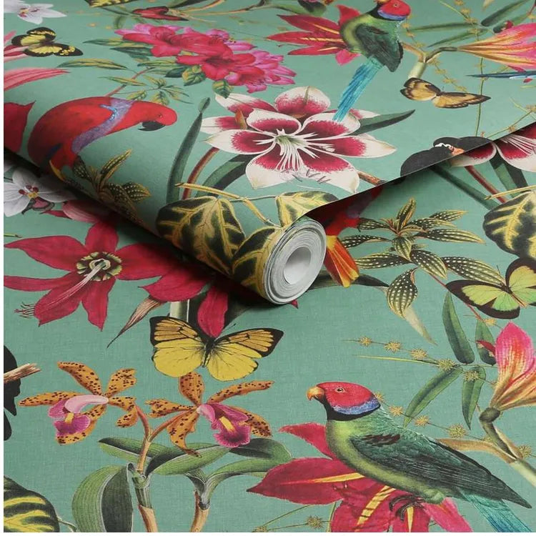 The Parrot Party wallpaper features an exquisite tropical motif, blending lush florals with vibrant exotic creatures. The design showcases striking hues of orange, yellow, and fuchsia pink, enhancing the elegance and vividness of this stunning pattern. Designed as 'paste the wall,' this wallpaper simplifies installation and removal, making the process both faster and more convenient.