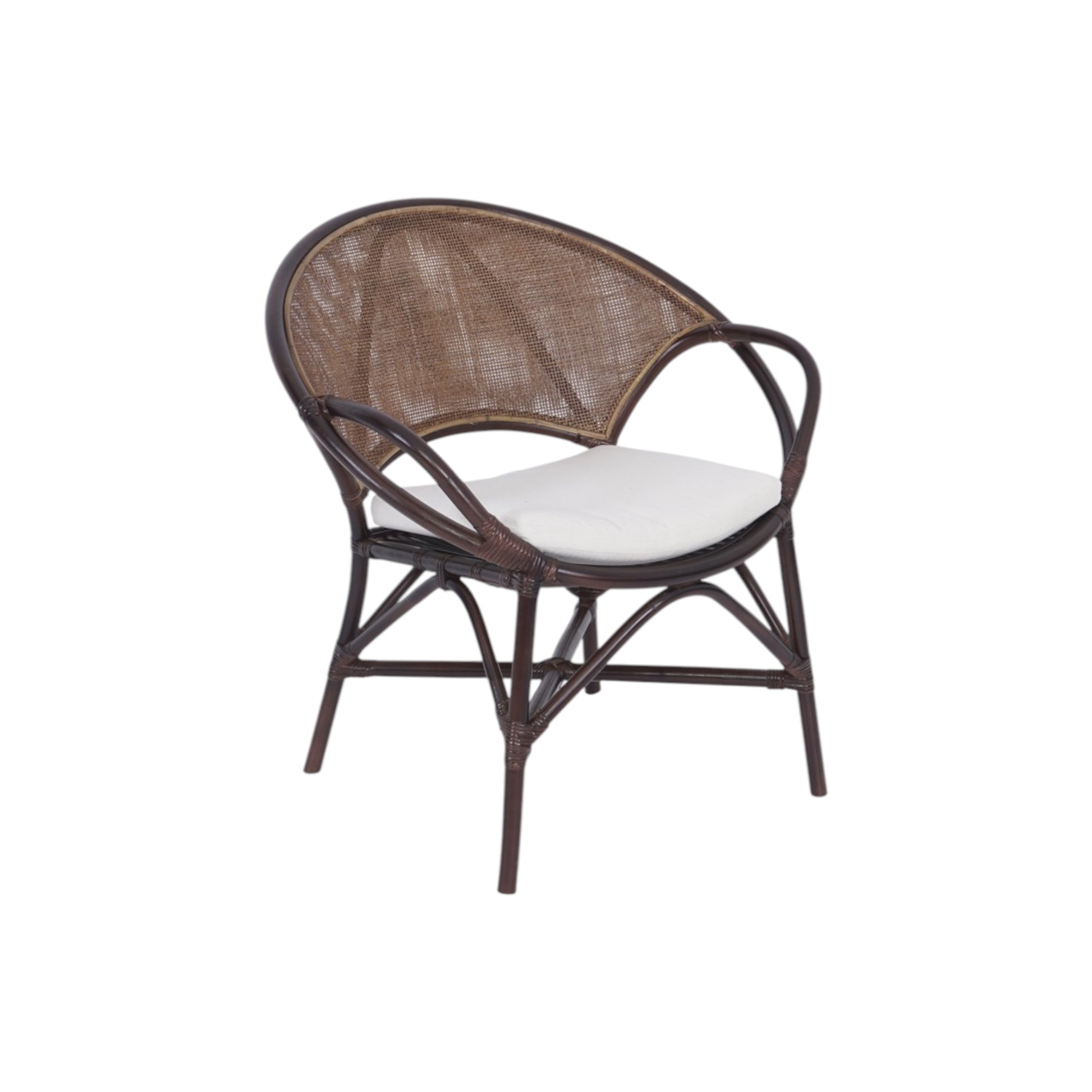 Relax in style with this elegant rattan armchair, designed to bring natural warmth and timeless charm to your home. Crafted with a sturdy rattan frame in a rich finish, it features a curved backrest and gently sloped arms for a graceful silhouette. The woven rattan detailing adds texture and an airy feel, while the removable seat cushion in a soft neutral fabric ensures comfort and versatility. Perfect for a living room, sunroom, or covered patio, this chair blends effortlessly with both classic and contemporary interiors.