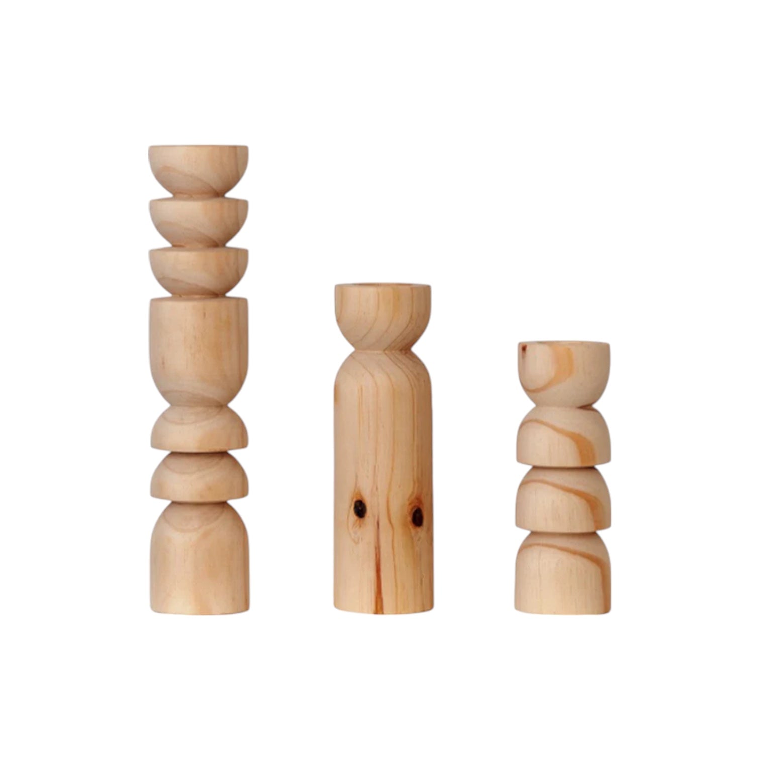 Elegantly crafted in pine, these beautifully molded candlesticks add an artistic charm to any environment. The natural wood grain adds warmth and personality, while the unique shapes create a bold visual statement. Illuminate your space with both light and imagination using these one-of-a-kind pieces.