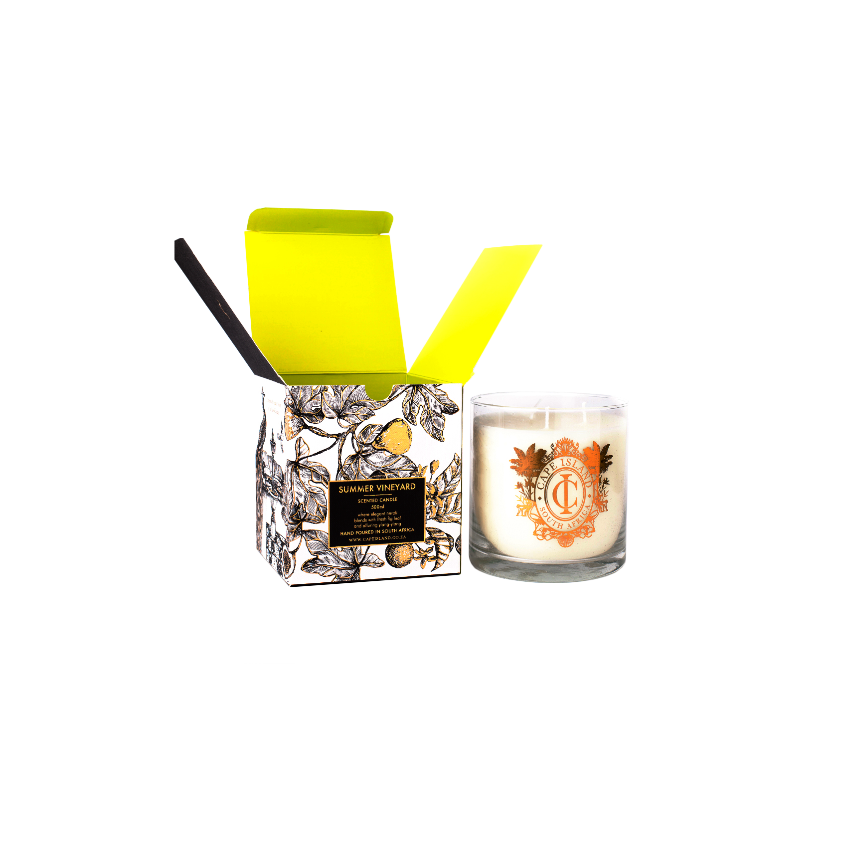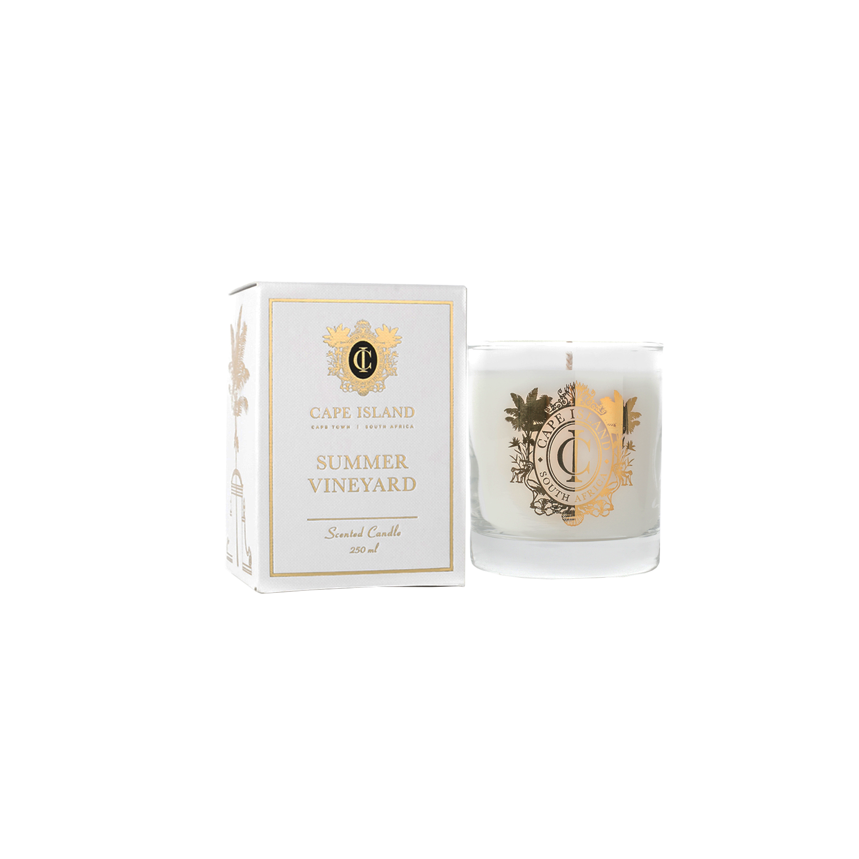 Celebrate the natural beauty of the Cape Winelands with this classic single wick scented candle packaged in a beautiful white and gold box. Our candles are hand poured in South Africa, using a soy wax blend and fine perfume oils imported from the Grasse region of France. The elegant Cape Island glass cup can be rinsed and recycled once the candle is done.