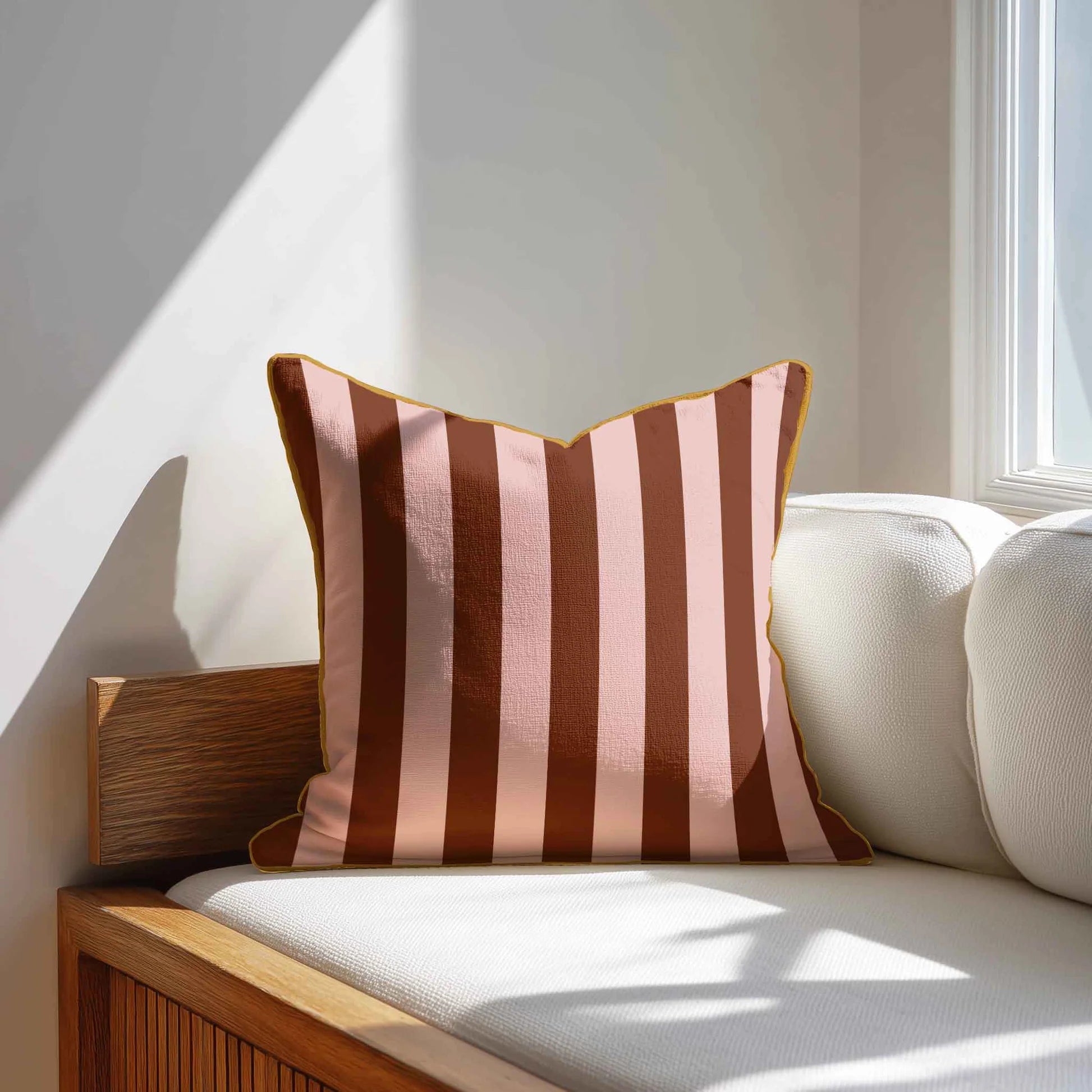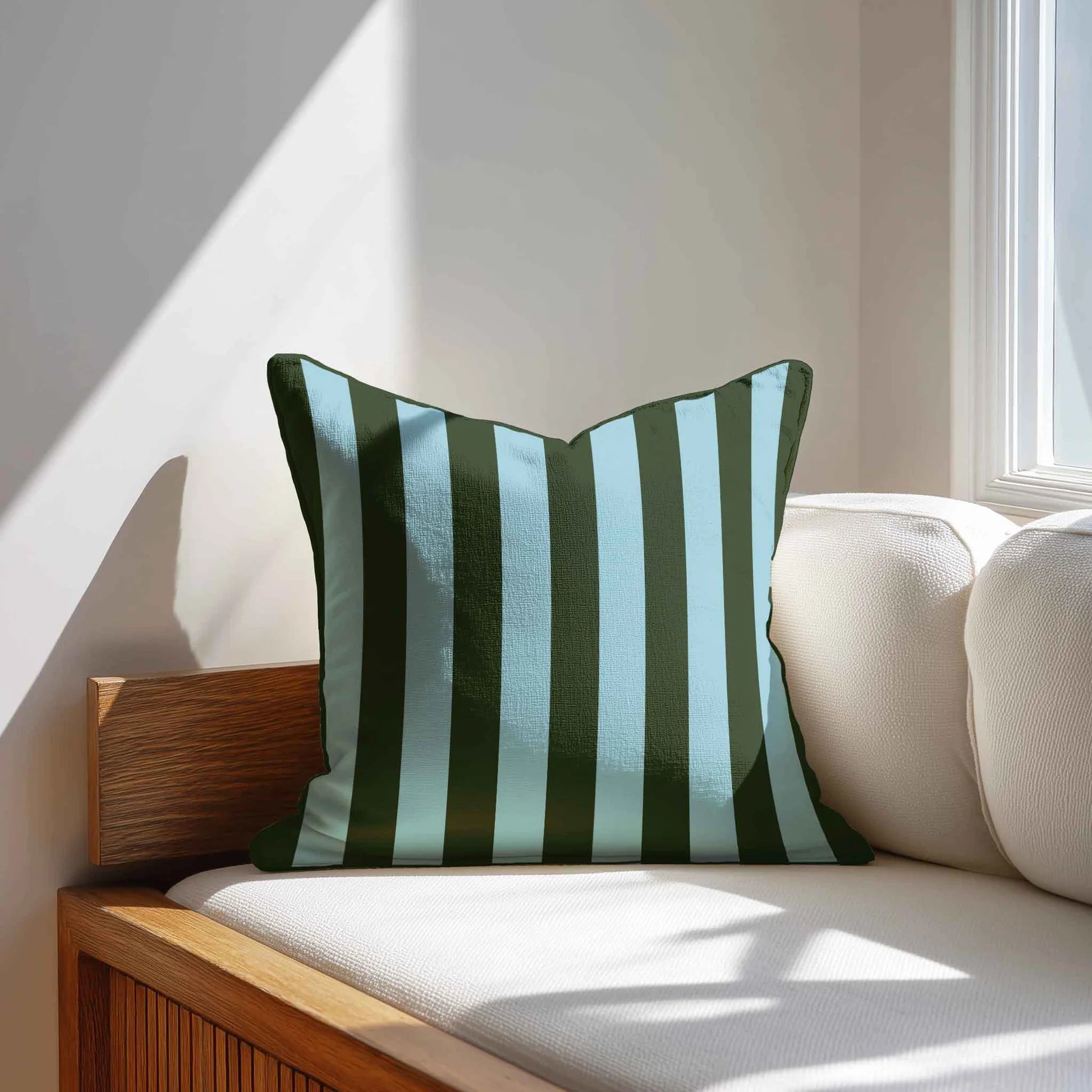 Each cushion features vertical stripes in vibrant color pairings — from earthy olives and ochres to punchy corals, pinks, blues, and greens. The contrasting edges add a tailored finish, making them perfect for layering on a sofa, armchair, or bed.