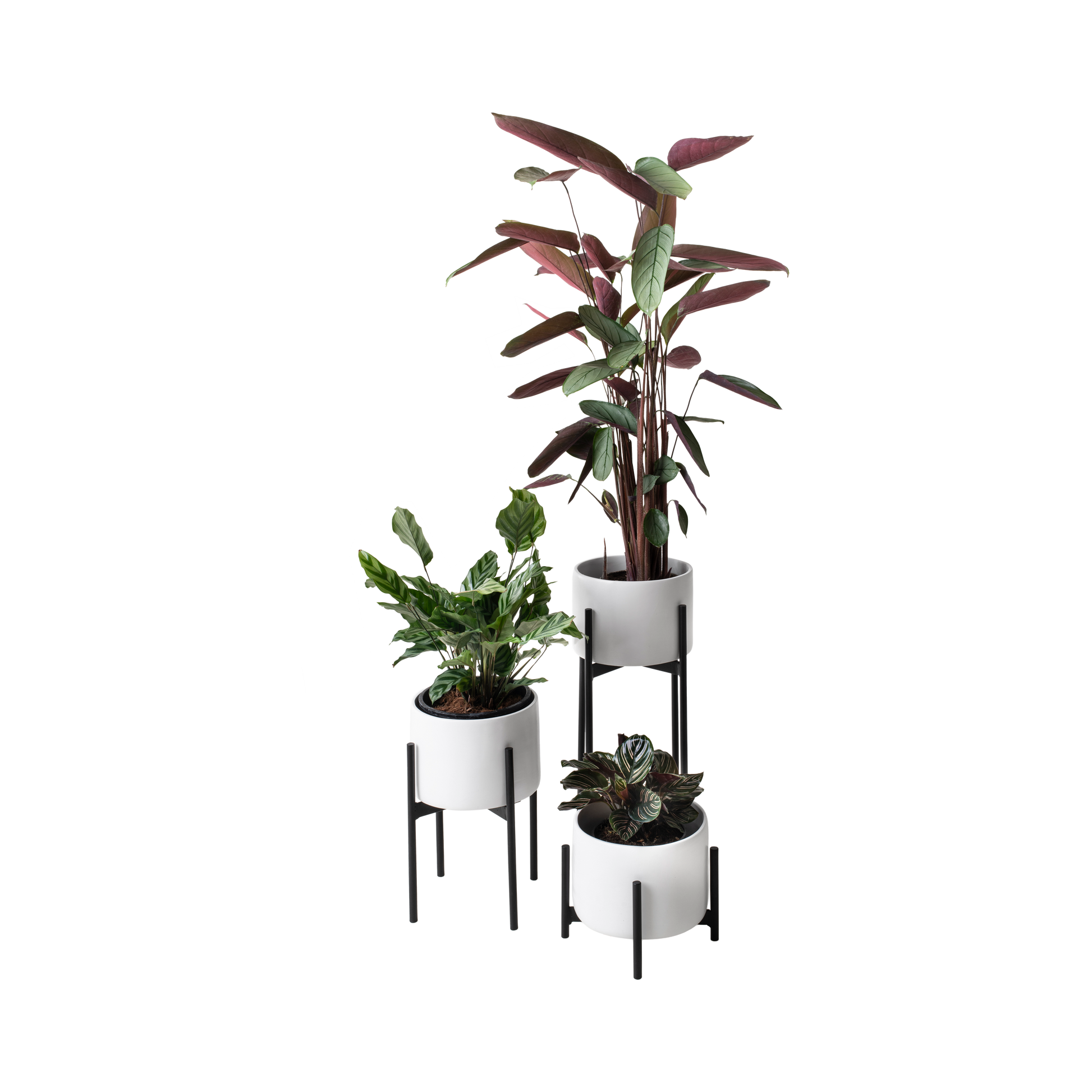 Give your plants a stylish place to sit with the help of this 3-piece pot planter set. Each planter has a cylindrical silhouette made from metal, and a simple white ceramic pot. The planters are held by slim metal legs in a black finish that bring a touch of style to your entryway, living room, or outside on the patio.