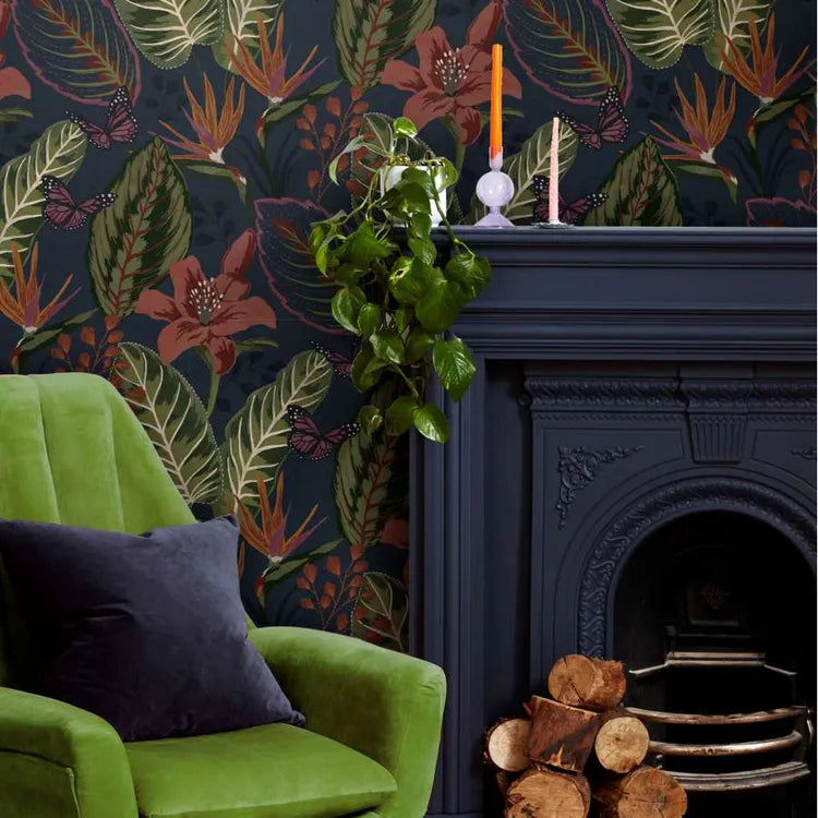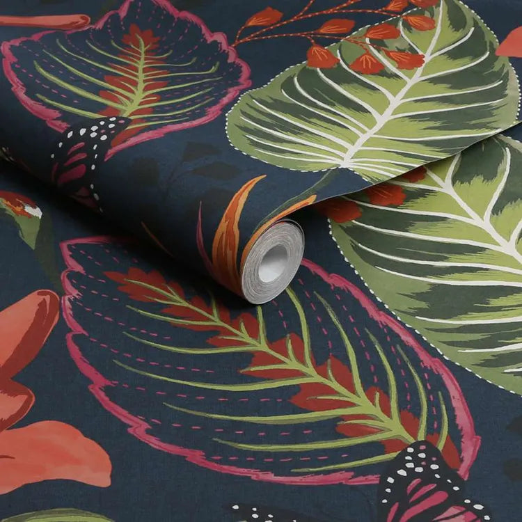 Step into paradise with the Wonderland wallpaper, showcasing a deep navy backdrop adorned with coral and green tropical florals and leaves, accented by occasional butterflies in a bold, large-scale pattern that commands attention. Designed as 'paste the wall,' this wallpaper simplifies installation and removal, making the process both faster and more convenient.